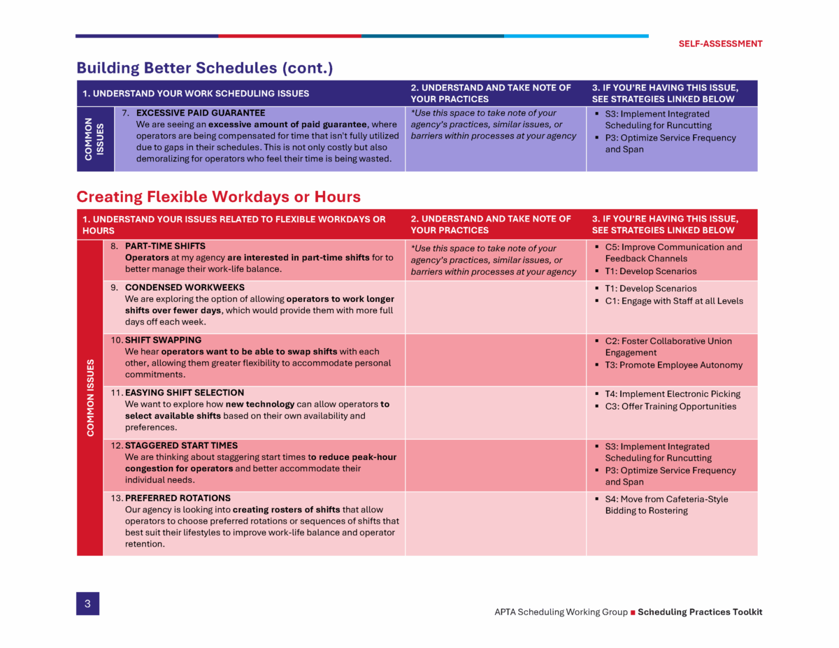 The Scheduling Practices Toolkit points to ways agencies can achieve more reliable service delivery, higher operator morale, and improved employee retention. These improvements translate into better experiences for riders and sustainable workforce solutions for transit agencies.