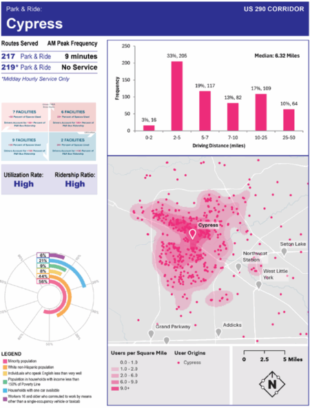 Foursquare ITP coordinated the survey of vehicles in 27 Park & Ride facilities over the course of three days. Based on photographs of vehicles surveyed, our team developed a machine learning process to extract text from plates and queried the Texas Department of Motor Vehicles (DMV) Motor Vehicle Information database to obtain the registration information for surveyed vehicles. Using these addresses, we performed demographic analyses of lot users and modeled the distance drive to reach the facility, and compared this alongside transit service levels. We also performed analyses of lot utilization and ridership to identify trends.
